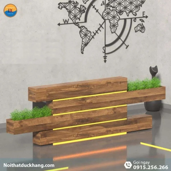Quầy lễ tân được làm từ chất liệu gỗ công nghiệp phủ Melamine cao cấp với độ dày 36mm. Có ưu điểm: Không cong vênh, chống mối mọt, giá lại rẻ, dễ dàng vệ sinh bàn làm việc khi có vết bám bẩn, tính thẩm mỹ cao.