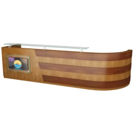 Quầy lễ tân gỗ công nghiệp, dán Veneer, bề mặt sơn phủ PU 03 lớp, màu sắc theo chỉ định. Quầy kết hợp đá và kính theo yêu cầu khách hàng.