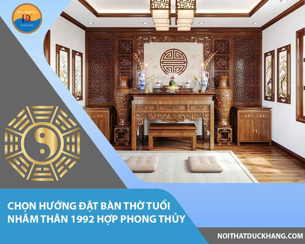 Chọn hướng đặt bàn thờ tuổi Nhâm Thân 1992 cho nam hợp phong thủy nên quay về các hướng tốt là: hướng Tây Nam (Sinh khí); hướng Tây Bắc (Thiên y); hướng Tây (Diên niên); hướng Đông Bắc (Phục vị) để được may mắn và như ý trong cuộc sống.