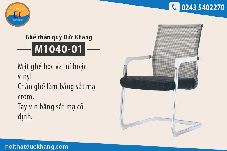 Ghế chân quỳ Đức Khang M1040-01 có thiết kế với lưng lưới, đệm ngồi bọc vải nỉ, tay vịn và chân ghế bằng sắt mạ crom cực bền. Ghế có kết cấu vững chắc, độ bền cao, an toàn khi sử dụng.