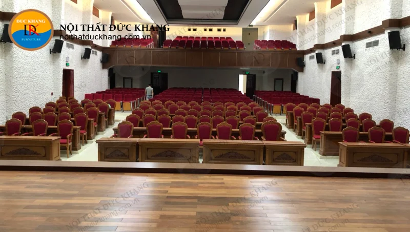 Hàng ghế lãnh đạo cũng được thi công riêng để không bị nhầm lẫn. Các hàng ghế được đặt cao dần để đảm bảo tầm nhìn lên sân khấu phía trước cho tất cả các vị trí ngồi. Sân khấu cao hơn so với nền, có bục lên xuống vừa tạo sự trang trọng vừa hỗ trợ tầm nhìn cho khán giả được tốt hơn. Các dãy ghế ngồi được chọn đồng bộ và tiện nghi, tạo nên không gian hài hòa và tiện nghi nhất.