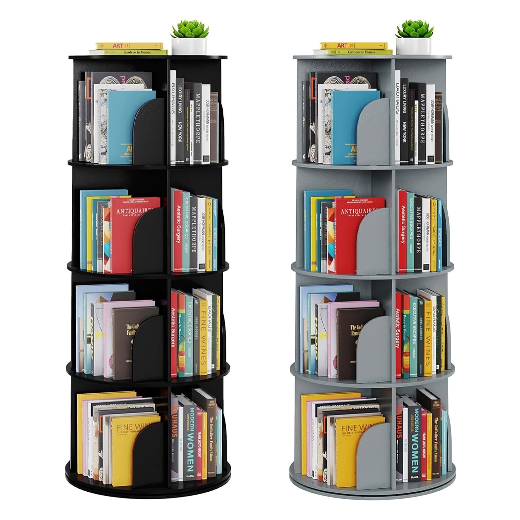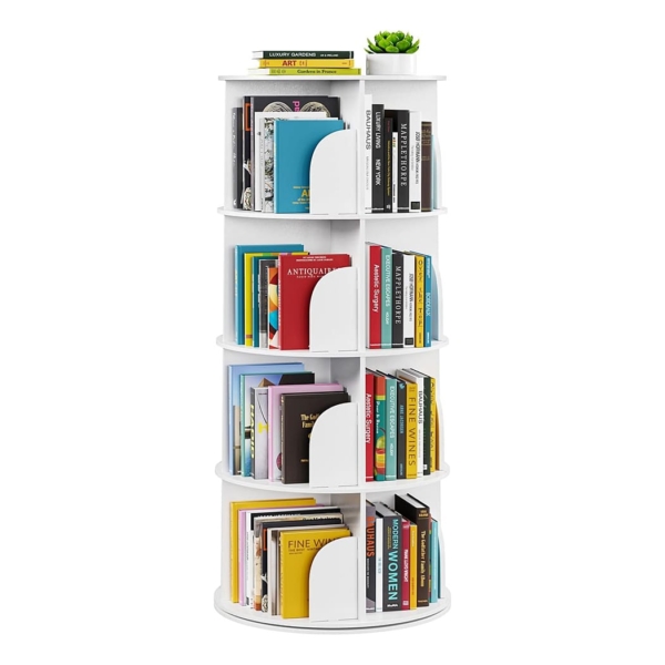 Mẫu kệ sách DKFKS44 có thiết kế lạ mắt với kiểu dáng trụ tròn đứng và khả năng xoay 360 độ, giúp người dùng dễ dàng cất giữ sách từ mọi phía. Kệ là dạng mở hoàn toàn, được chia thành 4 tầng, mỗi tầng lại được ngăn khoang chứa riêng biệt. Điểm nhấn đặc biệt là cơ chế xoay cùng các tấm chắn cong ở góc mỗi khoang, giúp sách đứng vững và được sắp xếp gọn gàng.