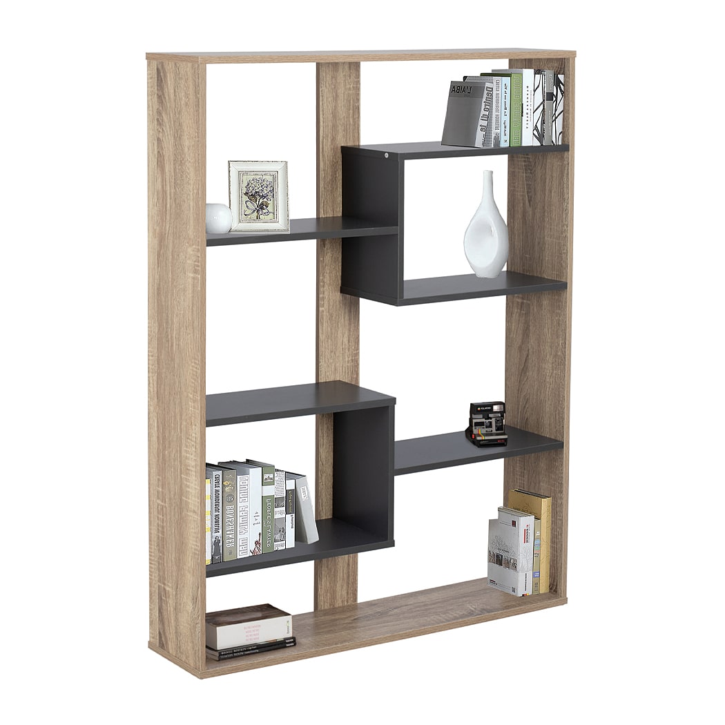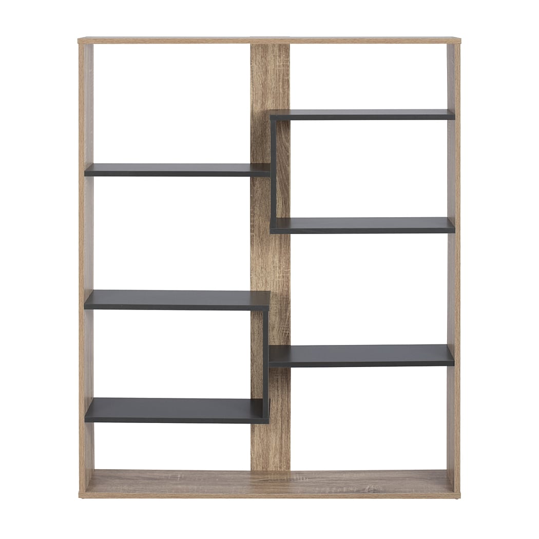Mẫu kệ sách DKFKS48 có kiểu dáng đứng thẳng, rộng và nổi bật với thiết kế bất đối xứng, phá cách rất thích hợp để làm kệ trang trí. Kệ dùng sự tương phản của 2 tông màu khung ngoài và các tấm kệ lớn có màu vân gỗ ấm áp, các khối kệ nhỏ bên trong có màu đen. Đây là kệ mở hoàn toàn gồm nhiều ngăn được bố trí theo kiểu ziczac. Điểm đặc biệt là 2 khối hình hộp vuông màu đen được lồng ghép và đặt so le, tạo nên sự chuyển động thị giác và tăng thêm không gian lưu trữ cho các vật dụng nhỏ.