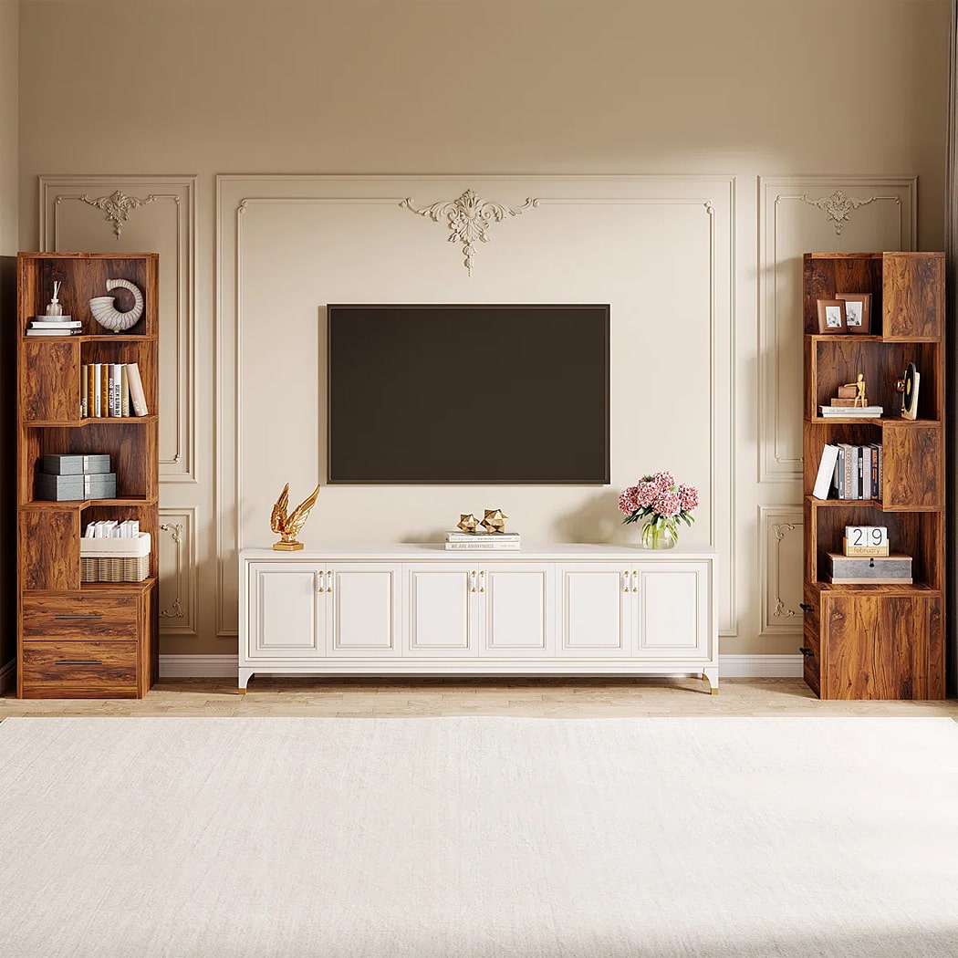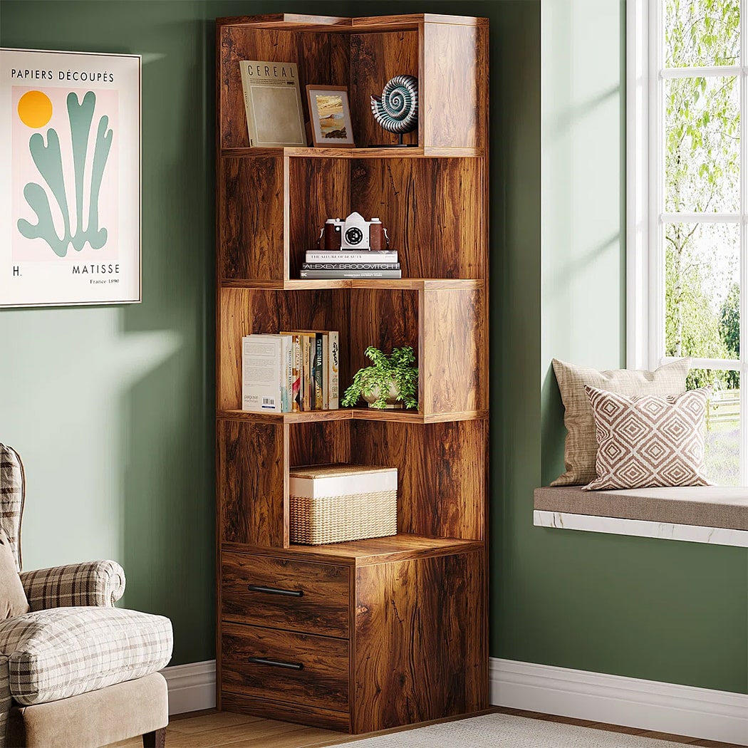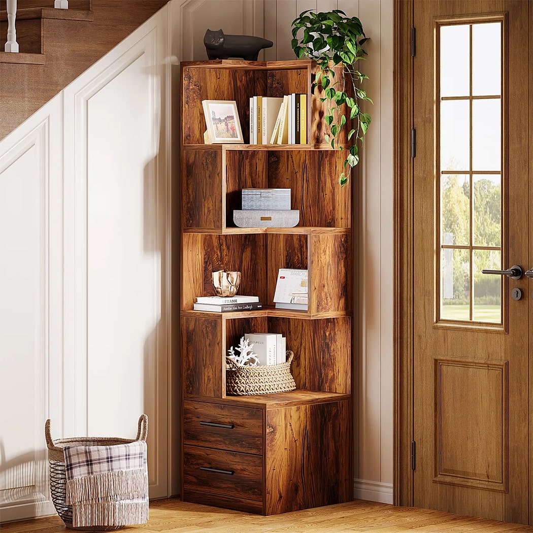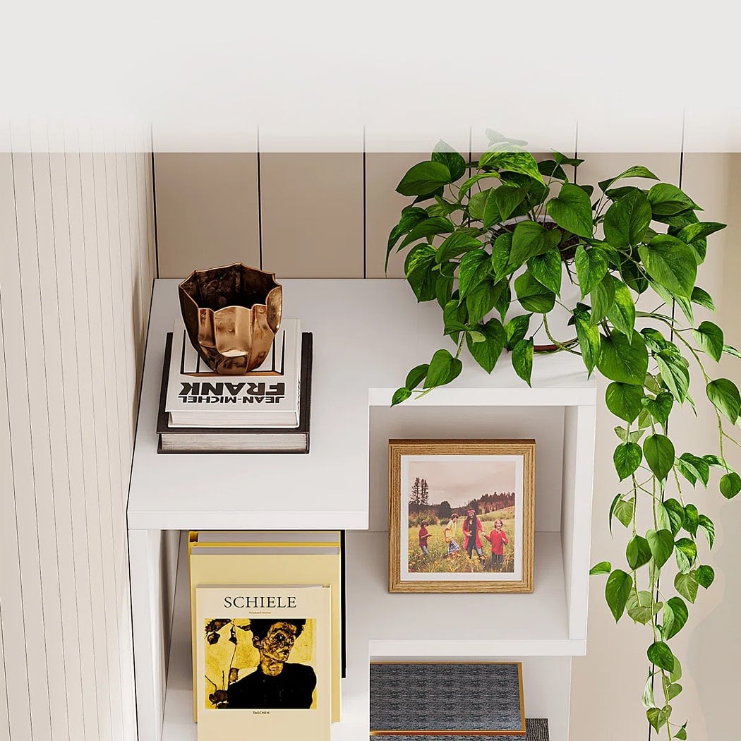 Mẫu kệ sách DKFKS59 có kiểu dáng góc tường hình chữ L đứng, cao giúp tận dụng tối đa không gian góc phòng. Kệ kết hợp cả kệ mở và lưu trữ kín, phần trên là kệ mở hoàn toàn với các ngăn được sắp xếp bất đối xứng, tạo sự độc đáo và linh hoạt trong trưng bày. Điểm nhấn là phần dưới có 2 hộc kéo kín, tay nắm màu vàng đồng sang trọng, cung cấp không gian lý tưởng để cất giữ đồ đạc, giữ cho phòng luôn ngăn nắp.
