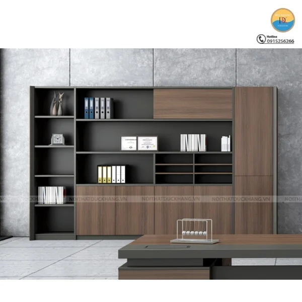 Khoang tủ thiết kế so le, được ngăn bởi đợt dày, chắc chắn. Những khoang này vừa có thể được dùng để đựng tài liệu vừa có thể đựng vật trang trí hoặc vật phẩm phong thủy tăng thêm may mắn và vượng khí cho lãnh đạo.