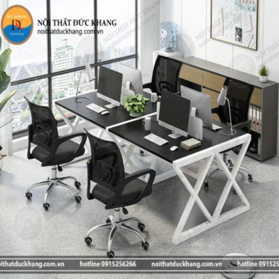 Module bàn làm việc 4 chỗ ngồi DKMD104 có kiểu dáng hiện đại, nổi bật với phần chân bàn hình chữ X đôi. Bàn được làm từ chất liệu gỗ công nghiệp phủ Melamine kết hợp sắt sơn tĩnh điện bền đẹp, giúp kéo dài tuổi thọ của sản phẩm lên tới 20 năm. Số lượng cụm bàn và màu sắc có thể tùy chọn linh hoạt tùy vào nhu cầu sử dụng.